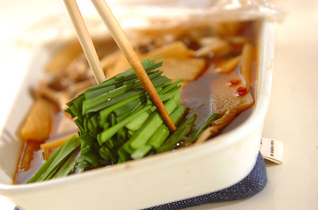 耐熱容器に大根を入れてタレをからめ、ラップをかけて電子レンジで3分加熱し、全体に混ぜ合わせてシメジを加え2分加熱する。さらにニラを加え、1分加熱する。器に(3)のサンマと盛り合わせる。