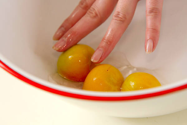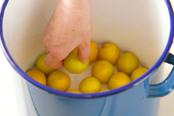 ホーロー容器の底に粗塩の1/5量位を振り入れる。ボウルにあけたホワイトリカーに梅を4~5個ずつ入れ、手のひらで優しく転がしながら、全体にホワイトリカーをからめ、ホーロー容器の底に1段分並べて粗塩を全体に振り、梅を並べ・・と梅と粗塩を重ねながら入れる。