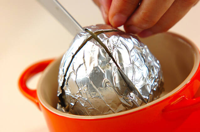 器に盛って上面に十字に切り込みを入れ、バターをのせる。お好みで塩をかけて、スプーンですくって召し上がって下さい。