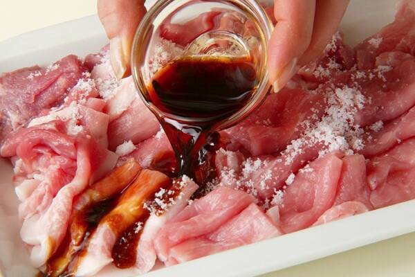 豚もも薄切り肉は4cmの長さに切り、<下味>をからめる。