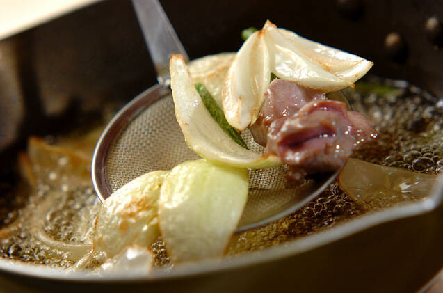 続けて玉ネギ、サヤインゲン、砂肝を順に揚げて取り出す。