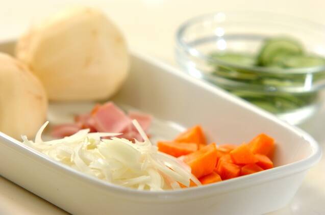 ジャガイモは、洗って皮をむく。ニンジンは皮をむいて、1cm角に切る。玉ネギは薄切り、ハムは1cm弱の幅に切る。キュウリは薄切りにして塩でもむ。