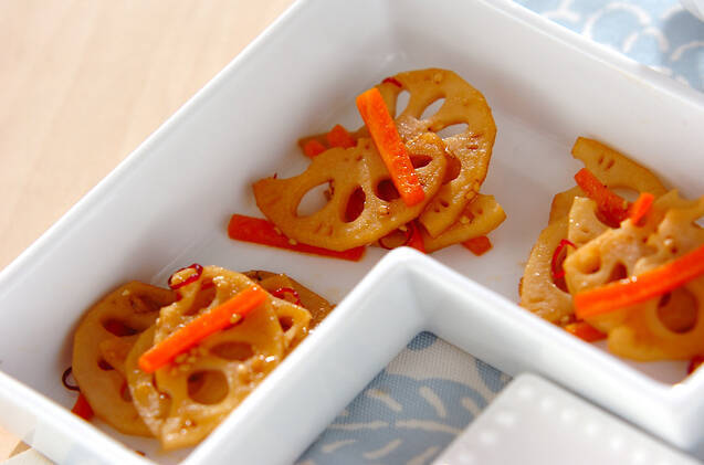 レンコンのシャキシャキとした食感がおいしい、お弁当にもオススメの一品。