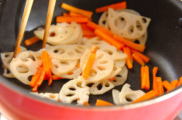 フライパンにサラダ油を強火で熱し、水きりしたレンコン、ニンジンを加え、レンコンが半透明になるまで炒め合わせる。