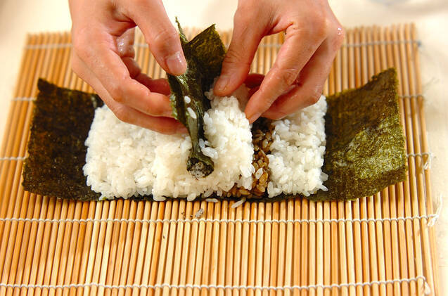 (5)の両側にそれぞれ白ご飯20gずつをのせる。