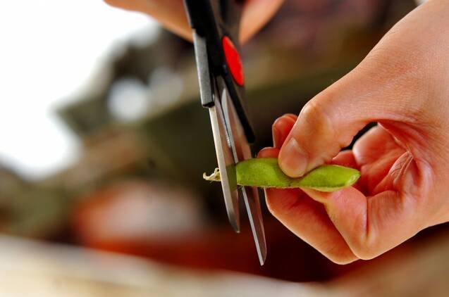 枝豆はハサミでサヤの両端を切り落とし、よく水で洗う。水気をきってボウルに入れ、塩でよくもむ。