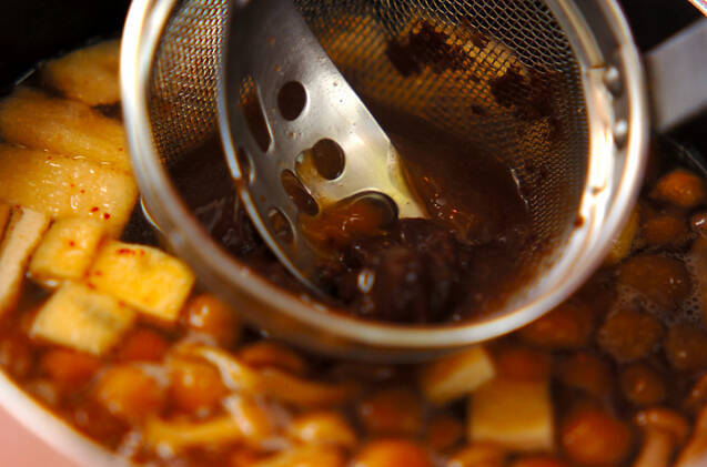 再び煮たったら火を弱め、赤みそを溶き入れて器に注ぐ。