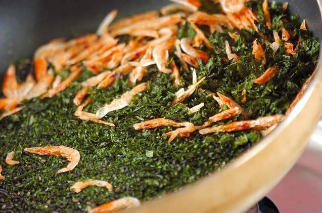アオサ、桜エビ、黒ゴマは合わせてフライパンで軽く乾煎りする。