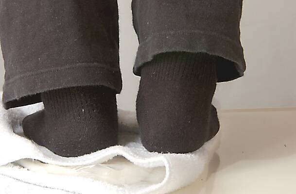 2をまとめて、2~3枚重ねた抗菌のビニール袋に入れ、バスタオルでビニールごとはさむ。それを足のかかとで踏み、生地をまとめ、かかとで踏み・・と繰り返し、滑らかな餅状になれば10等分に分けて丸める