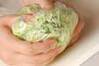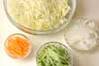 ボウル又は大きめのビニール袋に、キャベツ、ニンジン、キュウリ、玉ネギ、塩を入れ、全体に塩がからむまでよくもみ、10分置く。