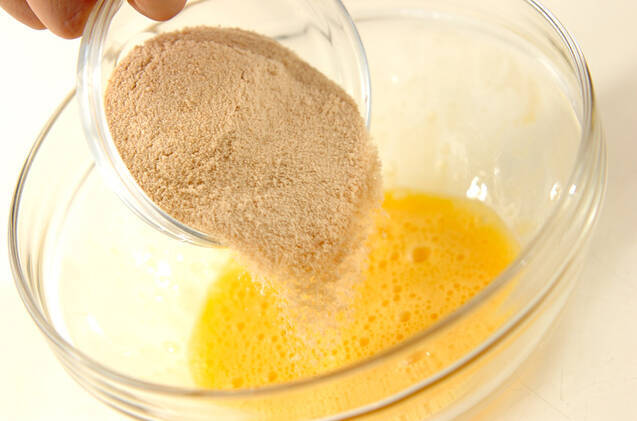 <生地>を作る。ボウルに卵を割り入れ、泡立て器で卵白のコシを切るように混ぜる。きび砂糖、みりん、水と合わせた重曹を加えて混ぜ合わせる。
