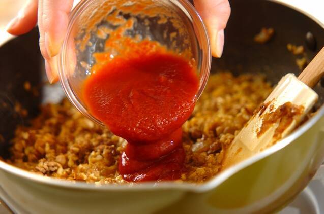 水煮大豆、水、トマトピューレ、みそ、しょうゆ、ローリエを入れ、ニンニクとショウガをすりおろしながら加える。