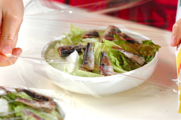 耐熱皿に白菜を並べ、汁気を軽くきったオイルサーディンを並べ、酒をかける。ラップをして電子レンジで2~3分加熱する。電子レンジは600Wを使用しています。