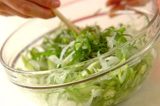 ボウルにゴマ油、ミルびき岩塩を入れてオクラ、玉ネギ、青ネギを和える。器に油揚げを盛り、合わせた野菜をのせ、しょうゆ、ショウガ汁をかける。お好みでミルびき岩塩をかけて下さい。