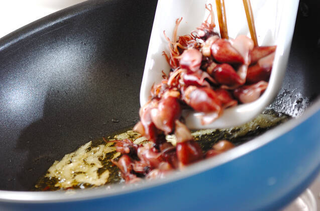 フライパンにオリーブ油、ニンニクを入れ弱めの中火にかけ、ニンニクの香りが立ってきたら赤唐辛子を加え、香りを油に移す。油に香りが移ったら、ホタルイカを加え軽く炒める。