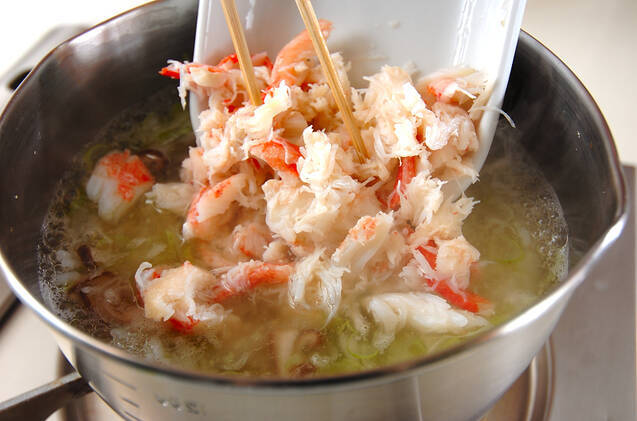 鍋にだし汁、白ネギ、白菜、生シイタケを入れて強火にかけ、煮立ってきたらご飯を加えて菜ばしで軽くほぐし、<調味料>とカニ身、葛きりを加える。