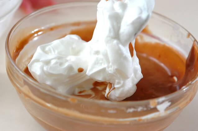 (2)に(3)を2回に分けて加え、ゴムベラでふんわりと泡を潰さないように混ぜる。器に流し入れ、冷蔵庫で冷やし固める。
