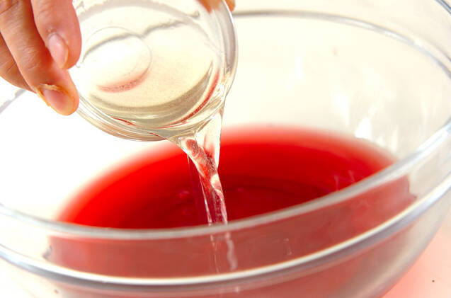 ふやかした粉ゼラチンを電子レンジで20秒程加熱して溶かし、ブドウジュースに加えて混ぜ合わせる。電子レンジは600Wを使用しています。