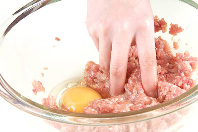 ボウルに豚ひき肉、<調味料>の酒、しょうゆ、塩コショウを入れ、手でグルグルかきまわすように練り、全体になじんできたら卵を加えてさらに混ぜ合わせる。
