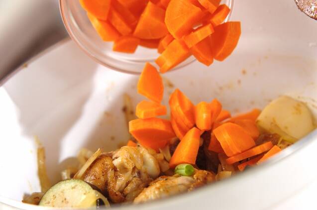 玉ネギが透き通ってきたら、残りの野菜を全て入れて炒め合わせる。