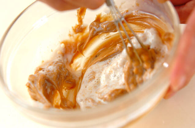 <パンケーキ生地>を作る。牛乳は電子レンジで温まる程度に加熱し、ピーナッツバターと混ぜ合わせる。ボウルに卵を割って牛乳と混ぜ合わせ、ホットケーキミックスを加えてよく混ぜる。