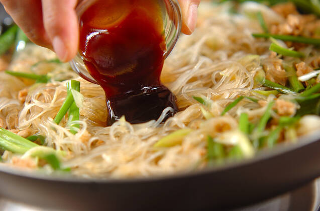 <スープ>の材料を加え、煮たったら白ネギを加える。しんなりしたら春雨、ニラを加え、炒め合わせる。全体に炒められたらオイスターソース、塩コショウで味を調え、器に盛る。