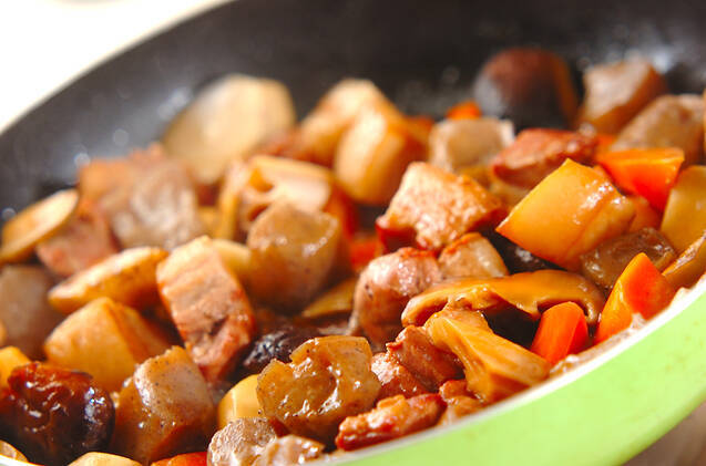 落とし蓋を取り、火を強めて汁気が少なくなるまで煮含め、器に盛り、サヤインゲンを散らす。