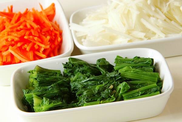 大根、ニンジンは皮をむき、3cmの長さに切って縦にせん切りにする。