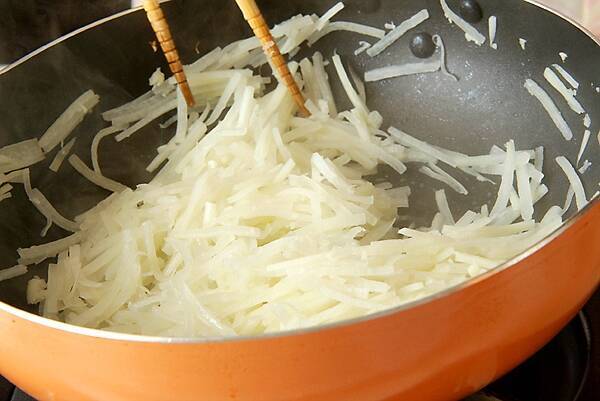 <大根ナムル>フライパンにゴマ油、おろしニンニクを入れて中火にかけ、香りが立ってくれば大根を加え、大根が透き通ってくれば火を止める。粗熱が取れればレモン汁、すり白ゴマ、塩、コショウをからめる。