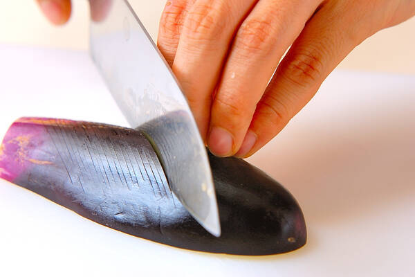 ナスはヘタを切り落として、縦半分に切る。表面に浅く斜めの切り込みを入れ、水に放つ。