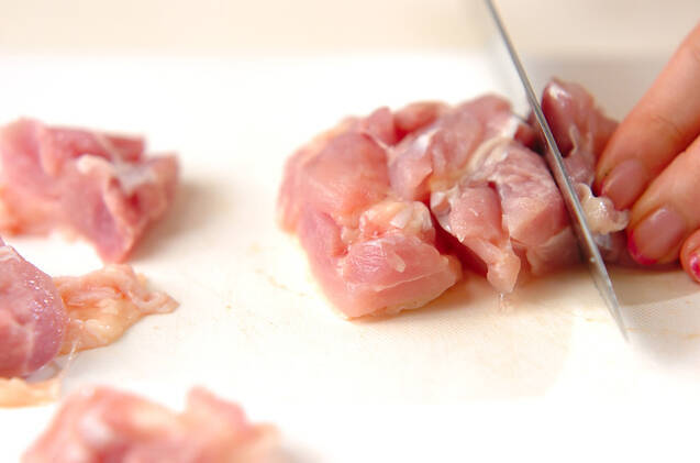 <唐揚げ>の鶏もも肉は、12切れに切って分量外の塩コショウをからめる。エビは殻と背ワタを取り、分量外の塩でもむ。グレーの汁が出てきたら分量外の片栗粉を加えてさらにもみ、水洗いして生臭みをとる。