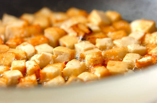 中華鍋にサラダ油、ゴマ油、ニンニクを入れて火にかけ、香りが立ってきたら厚揚げがカリカリになるまで炒め、いったん取り出す。
