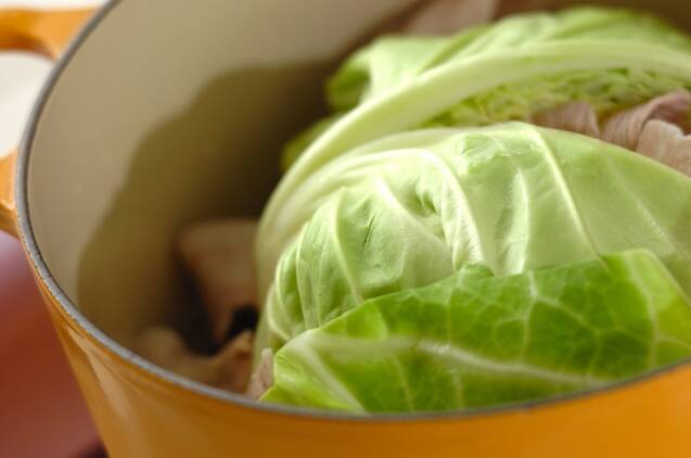 煮込み鍋に春キャベツ、豚バラ肉、<スープ>の材料を入れて中火にかける。