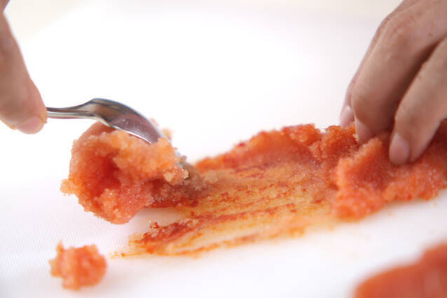 明太子は皮に切り込みを入れ、中身をしごき出す。