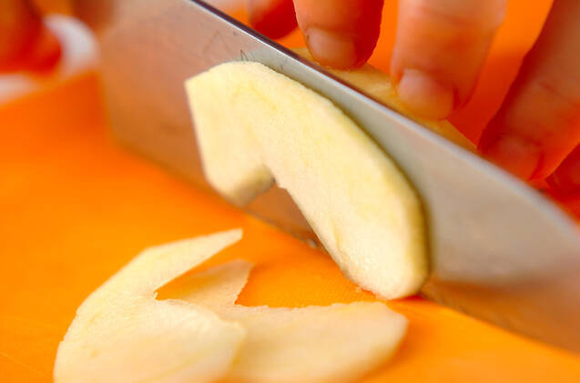 リンゴは皮をむき、芯を取ってくし切りにする。半分は薄切りにし、分量外の塩水につけておく。残り半分はすりおろして分量外の塩ひとつまみを混ぜる。