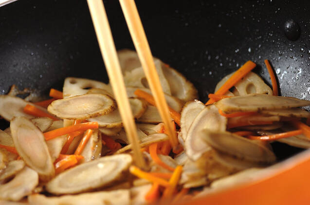 フライパンにサラダ油を入れて強火にかけ、水きりしたレンコン、ゴボウを炒め合わせ、さらにニンジンを炒め合わせる。