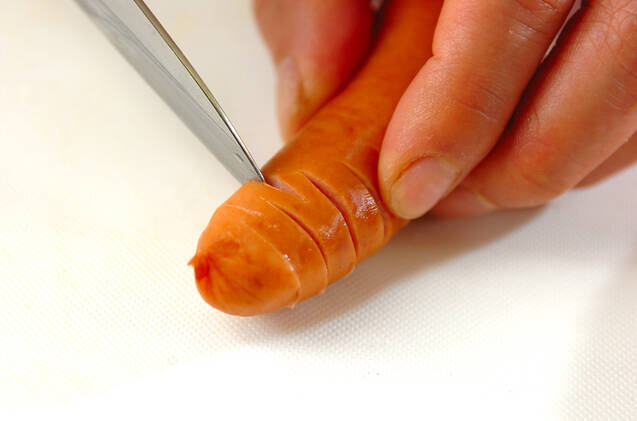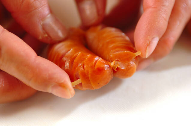<D>ソーセージは切り離さないように5mm間隔で切り込みを入れ、くるっと90度回転させ、さらに先ほど切った切れ目の間に切り込みを入れる。熱湯でサッとゆでて円の形になるように形を整え、端をスパゲティーで留める。食パンの上にのせ、中心に網に通したゆで卵の白身を入れ、ケチャップを絞り出す。(ヒント)スパゲティーは時間が経つと柔らかくなりますが、すぐに食べる場合はかたいので召し上がる時はご注意下さい。