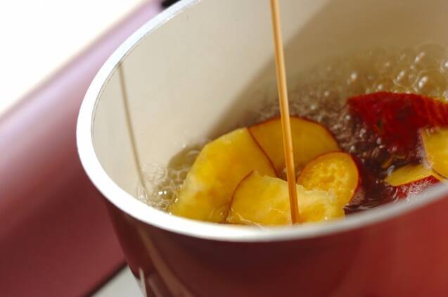 鍋にたっぷりの水とサツマイモを入れ、竹串がスッと刺さるまでゆでて、水気をきる。