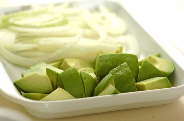 アボカドは、縦に一周切り込みを入れて半分に分け、種と皮を取り除いて食べやすい大きさに切る。
