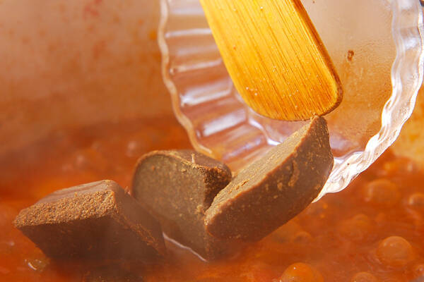 市販のカレールウを割り入れ、弱火で溶かし、更に5~6分時々混ぜながら弱火で煮込む。