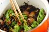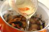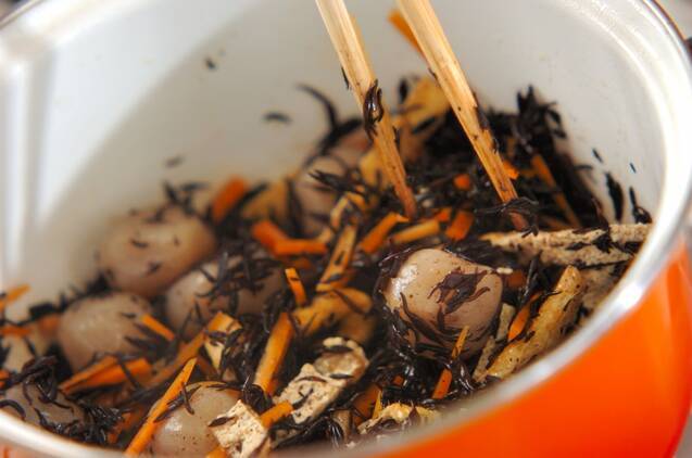 鍋にゴマ油を中火で熱し、芽ヒジキ、丸コンニャク、ニンジン、油揚げを炒める。