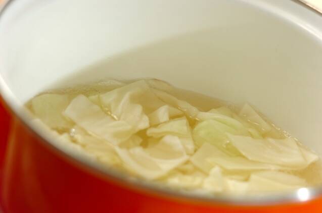 鍋にだし汁、キャベツを入れて強火で熱し、煮たったら火を弱める。