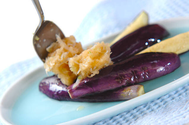 大根おろしにチリメンジャコ、ミツバを混ぜ合わせて1のナスにのせ、ぶぶあられを振り掛ける。お好みでしょうゆを掛けて下さい。