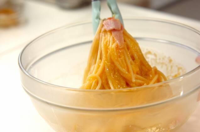 スパゲティーが熱いうちに<ソース>のボウルに入れ、手早くからめる。器に盛り、粗びき黒コショウを振る。
