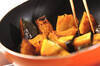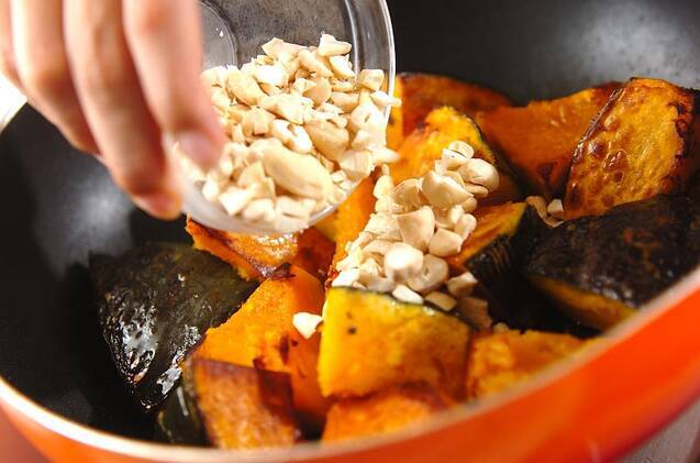 カシューナッツ、サヤインゲンを加えてサッと炒め、火を止める。<ソース>を加え、全体にからまったら器に盛る。