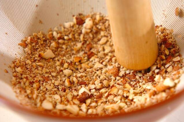 煎ったアーモンドをすり鉢ですり、またはハンドプロセッサーで細かくし、他の<和え衣>の材料と混ぜ合わせる。