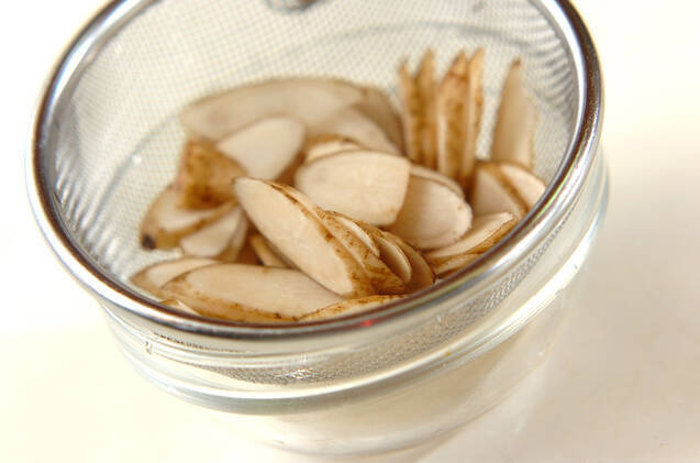 ゴボウはタワシできれいに水洗いし、薄い斜め切りにして水に放ち、ザルに上げる。