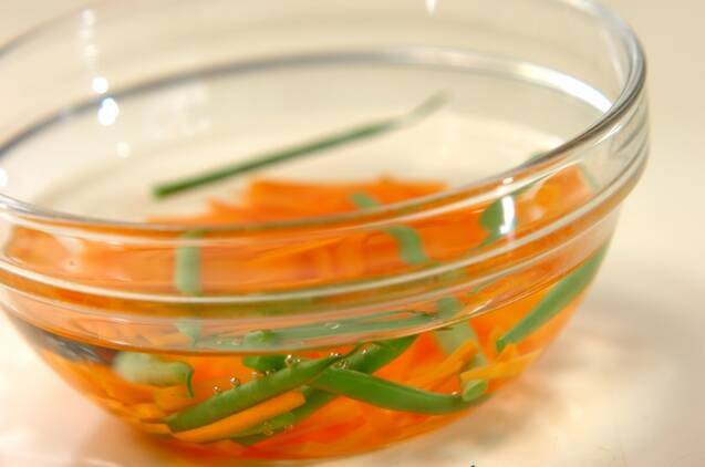 塩を入れた熱湯でニンジン、サヤインゲンをゆでて水に取り、粗熱が取れたら水気をきる。