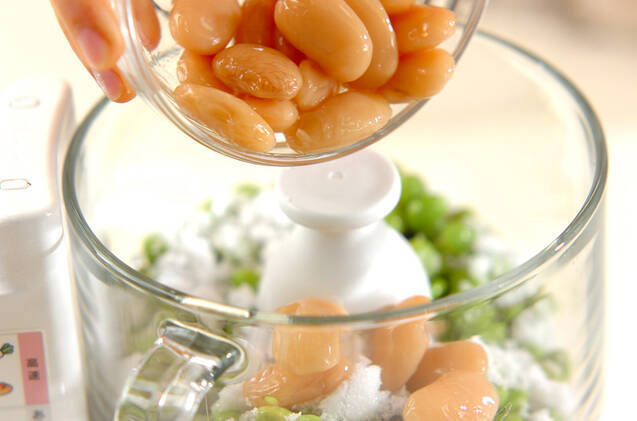 <生地>を休ませている間に具を作る。枝豆はサッと水洗いして塩をからめ、熱湯に入れる。煮たったら3~4分ゆでてザルに上げ、冷めたらサヤから出して薄皮をむく。フードプロセッサーに枝豆(200g)と砂糖、白花豆を入れ、ペースト状にする。