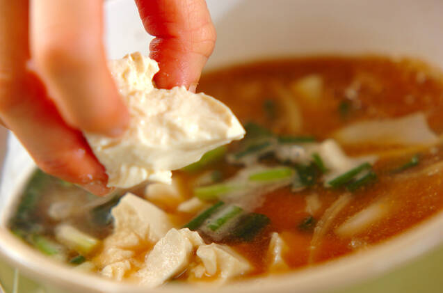 豆腐を手でちぎりながら加え、煮たつ直前に火を止めて器に注ぐ。